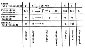 Inupiaq consonants differ from English consonants in some important ways. For example, in Inupiaq there is no b, d, or g (in linguistic terms, all stops are voiceless). As a result, many Inupiaqs have difficulty making the distinctions between b and p, d and t, and k and g in English, so that a pair of words like pill and bill may sound the same. On the other hand, Inupiaq has a number of consonant sounds not found in English, making it difficult for English speakers to say Inupiaq words correctly. You are sure to encounter the letter q, which represents a sound much like k but pronounced farther back in the throat. English speakers usually have trouble at first distinguishing k and q. The Inupiaq sound written g is pronounced like a French or German r; the Inupiaq sound written simply as g is not a stop (like English g) but a fricative, and may seem to be between g and y to English speakers. There are other Inupiaq sounds different from anything in English, but it is difficult to discuss them in a work of this nature.