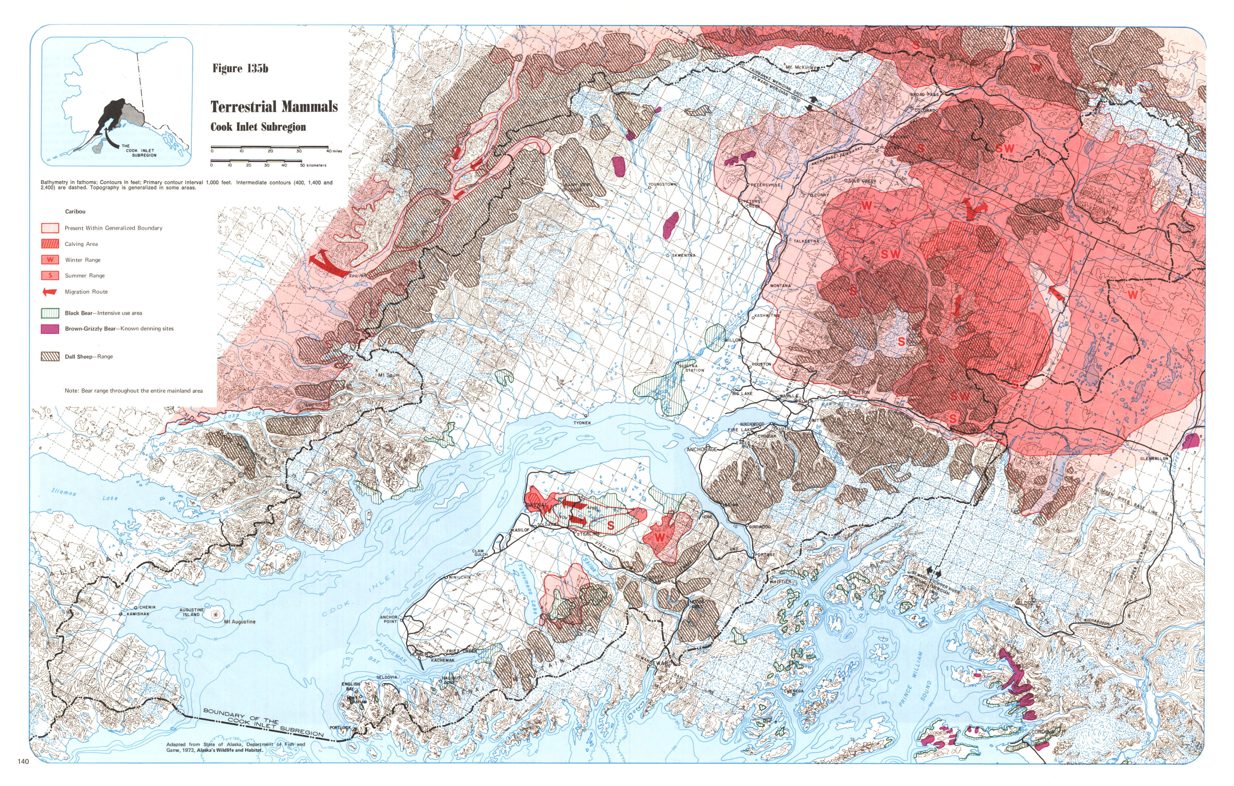 Barren ground caribou: The interior portion of the subregion contains a sizeable portion of the Nelchina caribou winter range as well as part of the herd's calving grounds in the west central section (Figure 135c). This herd once numbered about 70,000 animals but has declined in recent years to fewer than 20,000. Winter range deterioration is the suspected cause. No caribou are found along the coastal areas of Prince William Sound. The small Mentasta herd ranges over the eastern portion of the subregion but in recent years has become intermingled with the Nelchina herd and may be losing its identity.